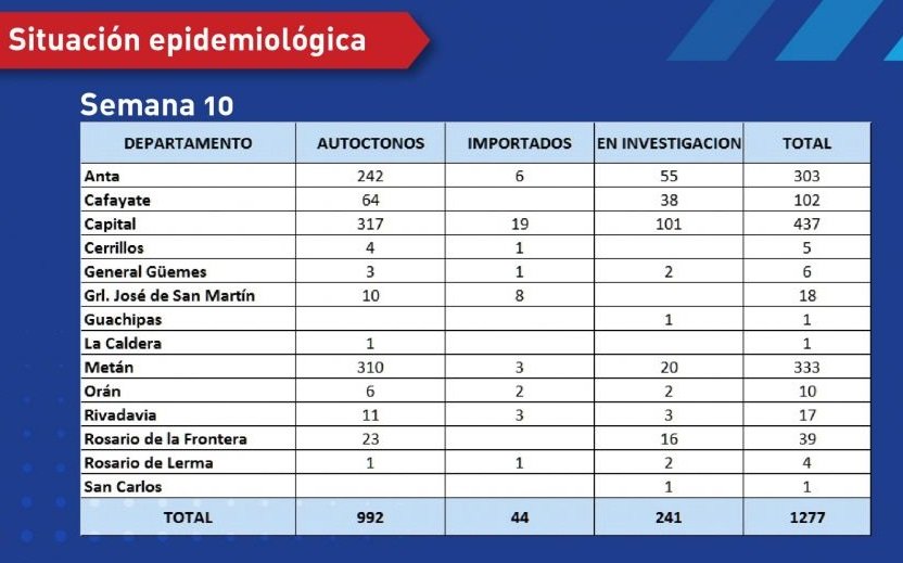 La cartera de Salud Pública de Salta informó que, entre el 1 de enero hasta el 4 de marzo, se han confirmado 1277 casos de Dengue, de los cuales 44 casos son importados, 992 autóctonos y 241 se encuentran en investigación para determinar el origen. Los mismos fueron confirmados en los siguientes departamentos: