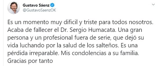 "Es un momento muy dificil y triste para todos nosotros. Acaba de fallecer el Dr. Sergio Humacata. Una gran persona y un profesional fuera de serie, que dejó su vida luchando por la salud de los salteños. Es una pérdida irreparable. Mis condolencias a su familia. Gracias por tanto"