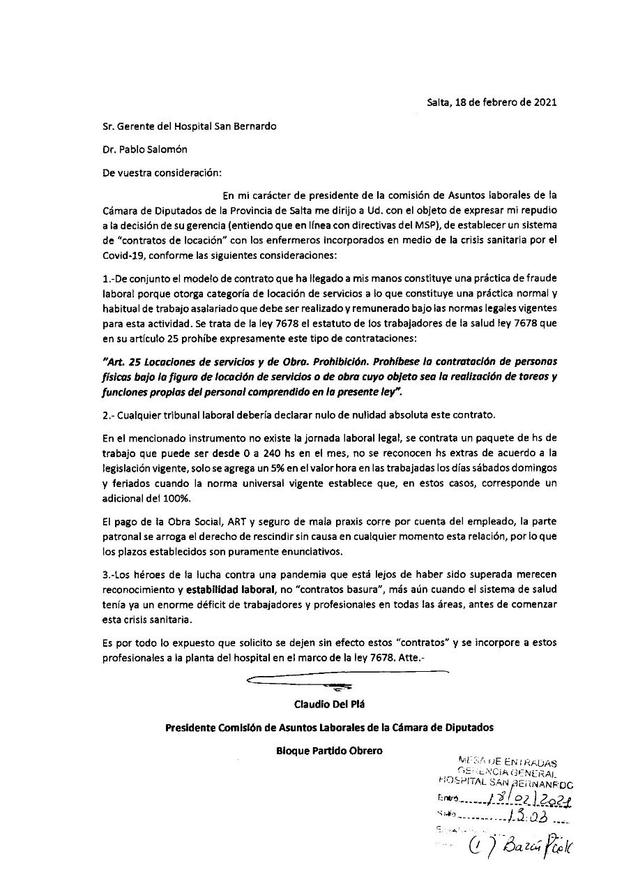 En la tarde de ayer, el diputado del Partido Obrero, Claudio Del Plá, presentó una nota dirigida al gerente del Hospital San Bernardo, en la que expresa su rechazo a la decisión de la gerencia de hacer firmar contratos de locación que están expresamente prohibidos por la ley 7678, vigente para los trabajadores del sector.