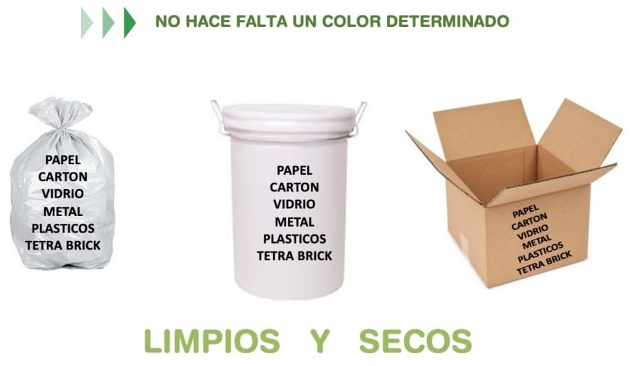 Papel, cartón, tetrabrik, vidrios, latas y envases plásticos medianos. Siempre deben estar limpios y secos.