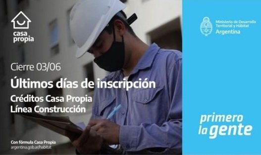 El Gobierno Nacional cerrará la inscripción para la línea Casa Propia- Construcción que promueve créditos a tasa cero para la ejecución de nuevas viviendas. Los interesados pueden completar el formulario online hasta este viernes 3 de junio.
