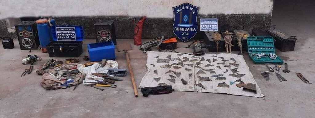 Producto de la requisa en los domicilios allanados secuestraron 58 trozos de placas de bronce que habrían sustraídos del cementerio zonal. Incautaron también un arma de aire comprimido, herramientas, baterías de camiones, amoladora, soldadora, parlantes, mochila fumigadora y 5 plantines de cannabis sativa por lo que dieron intervención a personal de Drogas Peligrosas.