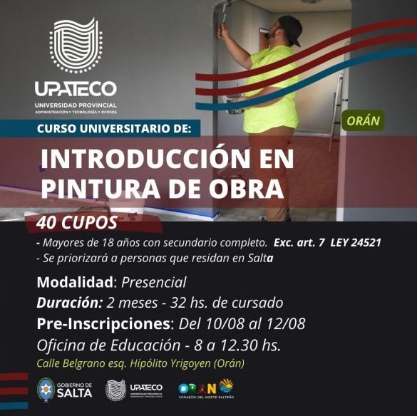 La Universidad Provincial de la Administración, Tecnologías y Oficios, abre hoy en la localidad de Orán, las preinscripciones para las capacitaciones en Introducción en Pintura de Obra e Introducción en la Construcción de Obras.
