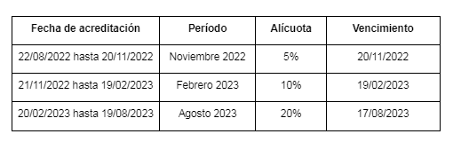Sobre el valor de la tenencia declarada se establecerá un impuesto especial, cuya alícuota variará de acuerdo al momento en que se acrediten los fondos en la cuenta especial. La alícuota del impuesto especial surgirá del siguiente detalle: