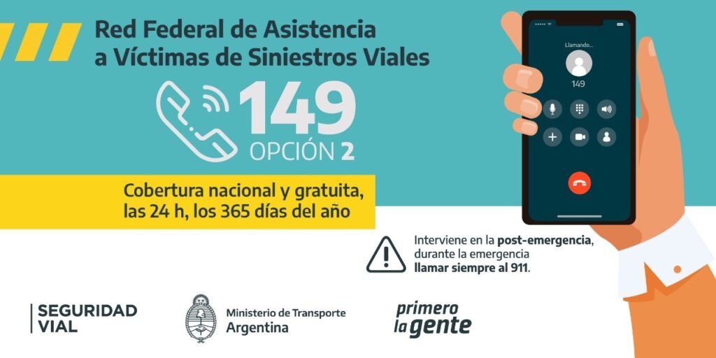 La línea de atención telefónica 149 opción 2 es un servicio gratuito que funciona en todo el país para la asistencia a las víctimas de siniestros viales y a sus familias. Pertenece a la Agencia Nacional de Seguridad Vial (ANSV) -organismo del Ministerio de Transporte- y busca cubrir las necesidades que pueden surgir ante un siniestro vial.