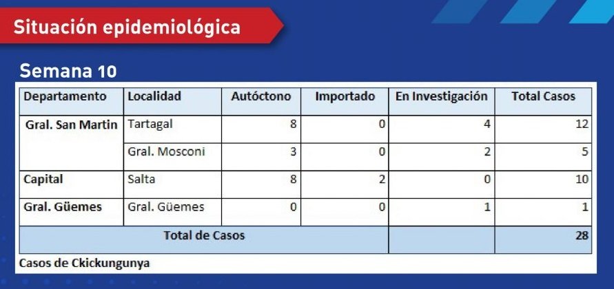 La cartera de Salud Pública de Salta informó que, entre el 1 de enero hasta el 4 de marzo, se han confirmado 1277 casos de Dengue, de los cuales 44 casos son importados, 992 autóctonos y 241 se encuentran en investigación para determinar el origen. Los mismos fueron confirmados en los siguientes departamentos: