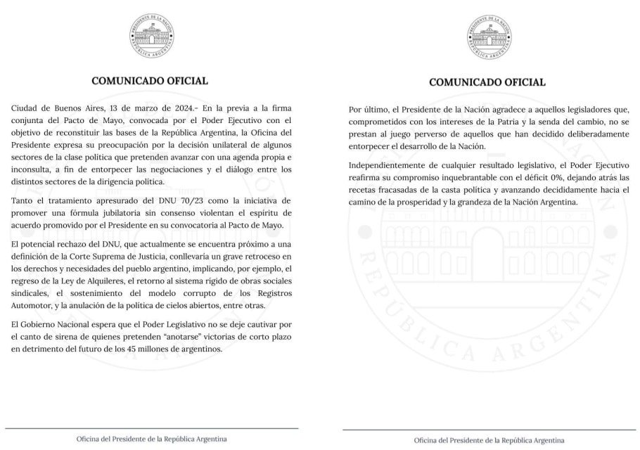 "En la previa a la firma conjunta del Pacto de Mayo, convocada por el Poder Ejecutivo con el objetivo de reconstituir las bases de la República Argentina, la Oficina del Presidente expresa su preocupación por la decisión unilateral de algunos sectores de la clase política que pretenden avanzar con una agenda propia e inconsulta, a fin de entorpecer las negociaciones y el diálogo entre los distintos sectores de la dirigencia política”, inicia el comunicado.