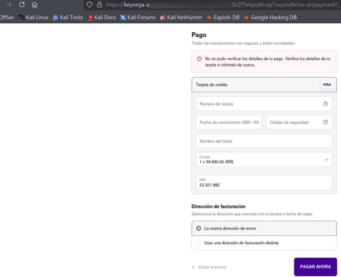 • Medios de pago sospechosos: La finalidad de este sitio es hacerse con datos financieros. En el momento en el que la víctima decide hace su pago, se la redirige a un sitio específico con otro dominio que continúa con la apariencia de ser una tienda online legítima. Durante el proceso de pago, el sitio solicita todos los datos de la tarjeta, pero el pago nunca llega a procesarse porque no existe ningún medio de pago real configurado. Esto significa que el error que aparece al intentar pagar no es un fallo real, sino parte de la trampa para que el usuario ingrese los datos varias veces.