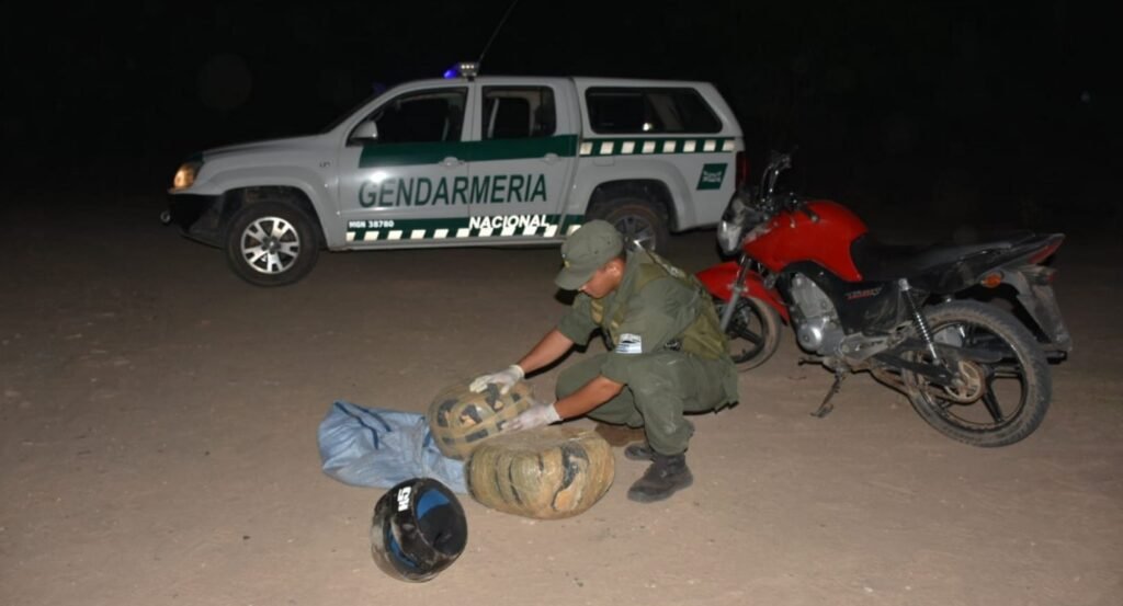 Ante tal situación, los gendarmes comenzaron un seguimiento controlado del rodado y divisaron que a unos metros los ocupantes (dos hombres) se cayeron al piso, los cuales abandonaron la moto (sin patente) como así también un bulto de grandes dimensiones. Ambos emprendieron una veloz huida hacia la vegetación.