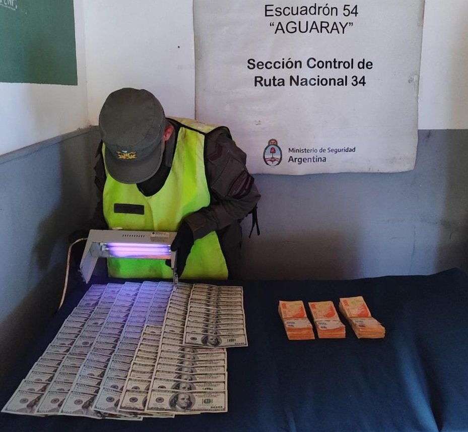 Al momento de la inspección física de la cabina, los funcionarios constataron la presencia de 13.000 dólares estadounidenses y 300.000 pesos argentinos sin documentación que avale su legal tenencia y traslado.