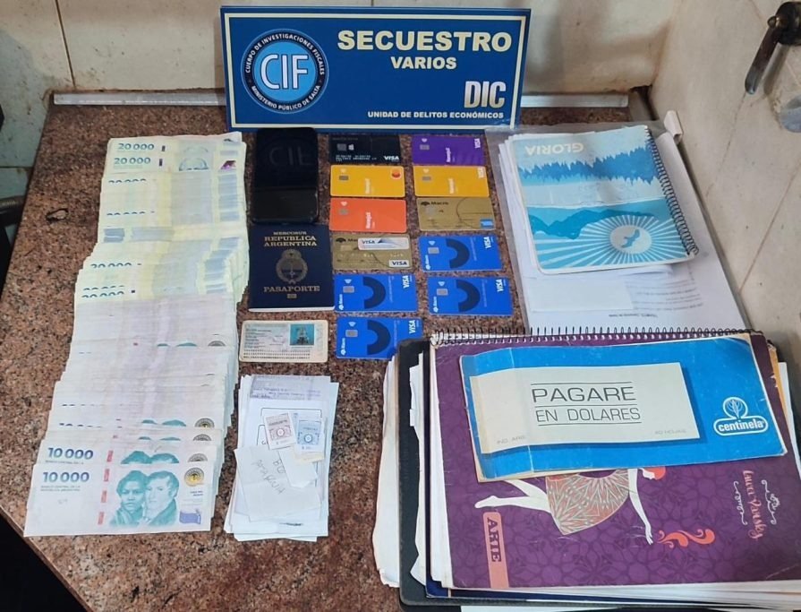 Como resultado de los allanamientos, en el estudio jurídico ubicado en avenida Uruguay se secuestró dinero en moneda nacional y extranjera, una computadora, tres teléfonos celulares, documentación, expedientes y pagarés relacionados con la causa.