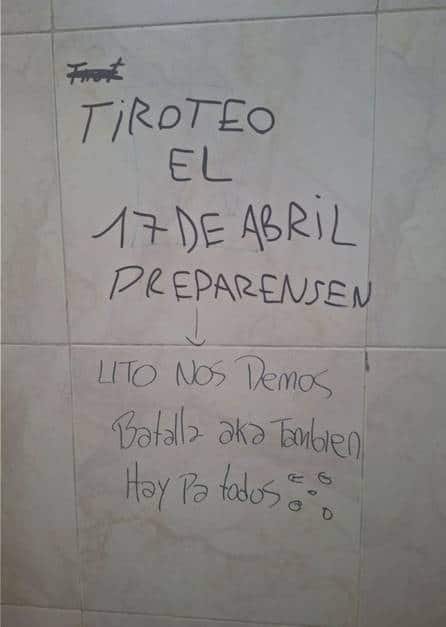 Autoridades del colegio 5033 de la capital salteña reportaron al Sistema de Emergencias 911 el hallazgo de un mensaje con contenido amenazante escrito en un baño de hombres ubicado en la primera planta del establecimiento.