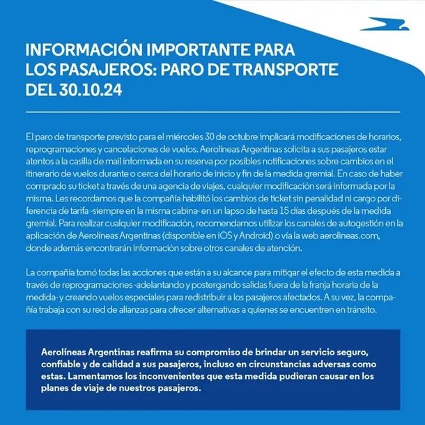 Debido al paro anunciado por la Mesa Nacional del Transporte en el AMBA (Área Metropolitana de Buenos Aires), Aerolíneas Argentinas informó que habrá modificaciones en los horarios, reprogramaciones y cancelaciones en los vuelos del miércoles 30 de octubre.