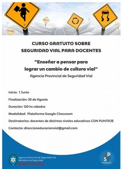 Profesionales de la Agencia Provincial de Seguridad Vial brindarán un curso gratuito denominado “Enseñar a pensar para lograr un cambio de cultura vial”, destinado a docentes de los niveles inicial, primario y secundario.
