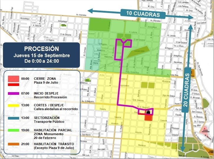 Mañana jueves 15, a partir de las 00 comenzará el operativo especial y no se permitirá el estacionamiento de vehículos en inmediaciones de plaza 9 de Julio. A partir de las 7 de la mañana, se procederá a despejar la zona del recorrido de la procesión.