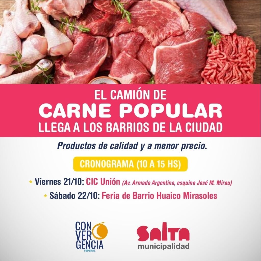 La comuna capitalina informó que hoy viernes el camión de «Carne popular» se ubica en el CIC de barrio Unión y mañana sábado en la feria del barrio Huaico Mirasoles. En ambas jornadas, el horario de atención es de 10 a 15 horas.