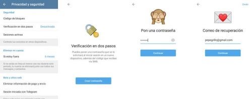 Dentro de las opciones de seguridad permite configurar un ‘Código de bloqueo’, que consiste en un PIN o huella digital que solicitará la aplicación para ingresar. Este código es independiente del PIN o código del teléfono y es una opción extra para resguardar las conversaciones. En esta sección también se permite habilitar la ‘Verificación en dos pasos’, la cual funciona con una contraseña y un correo de recuperación exactamente igual que en WhatsApp y es la configuración que evitará que un atacante pueda clonar la cuenta a través del número de teléfono. Además, cuenta con la opción de poder eliminar la cuenta y toda la información de los servidores de Telegram en caso de no utilizar la aplicación por un determinado tiempo, por ejemplo, 6 meses.