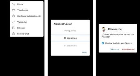 Por último, estos chats permiten eliminarlos también del equipo del receptor e incluso configurar la ‘autodestrucción’ luego de un determinado tiempo. Es decir que, una vez que el receptor ve el mensaje y pasa el tiempo configurado, el mensaje se elimina automáticamente de ambos dispositivos sin dejar rastro.