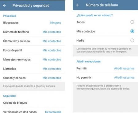 Al igual que en la mayoría de las aplicaciones el menú principal de Telegram se encuentran las opciones de Privacidad y seguridad y la Política de privacidad que desde ESET recomiendan leer atentamente. Entre estas configuraciones de privacidad se permite elegir con quien – o quienes – se compartirá la información, como el número de teléfono, última vez en línea y foto de perfil. Desde ESET destacan que no hace falta compartir el número de teléfono para comunicarse con otras personas, ya que se puede utilizar simplemente un usuario de Telegram y resguardar así el número personal. Además, permite ver contactos bloqueados, así como quienes pueden reenviar mensajes, agregar a grupos y canales y recibir llamadas.