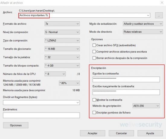 Se despliega una ventana con una gran cantidad de opciones avanzadas, las que interesan para esta acción serán: el nombre de la carpeta que quedará comprimida y protegida, y la sección de cifrado, donde se podrá configurar la contraseña y ajustar el método de cifrado. Además, se podrá elegir el tipo de archivo comprimido a utilizar; por ejemplo: .zip o .7z.