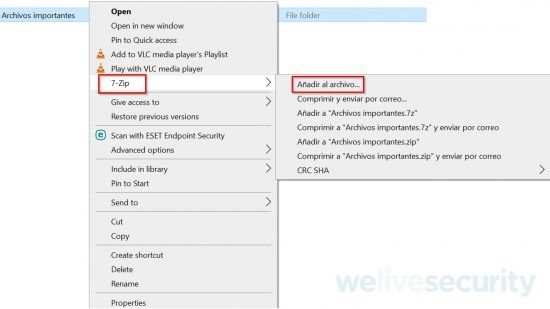 Una vez instalado se hace clic derecho sobre la carpeta que se desee proteger, se selecciona el submenú de 7-Zip y luego la opción “Añadir al archivo” o “Add to file”.