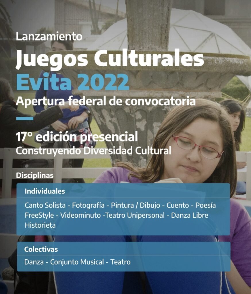 La Secretaría de Cultura invita a participar de los Juegos Culturales Evita, cuyo objetivo es promover la participación y fomentar las identidades locales para fortalecer la inclusión social, por medio de las expresiones culturales, junto con el trabajo en equipo en ámbitos respetuosos y solidarios.