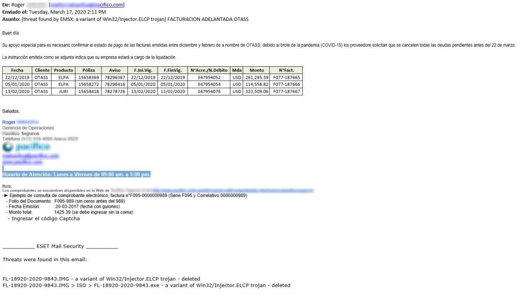 Además, se identificó un correo relacionado a otra campaña de ingeniería social, aparentemente dirigida a usuarios de Perú, ya que hace referencia al Organismo Técnico de la Administración de los Servicios de Saneamiento (OTASS) y refiere a la urgencia en el pago de facturas debido al brote de COVID-19. El correo incluye un archivo adjunto malicioso que esconde un troyano.