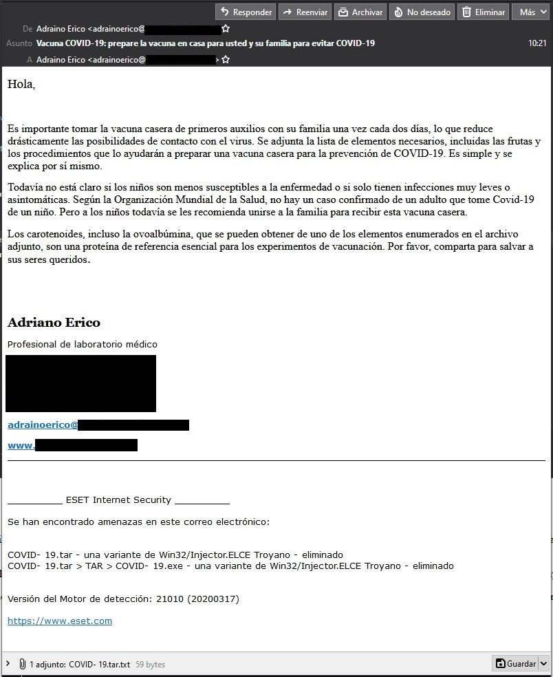 Desde ESET España alertaron esta semana sobre un correo de phishing, en un correcto español, que hace alusión a la preparación de una vacuna casera para evitar la enfermedad. El falso correo incluye un adjunto que contiene la supuesta lista de elementos necesarios para preparar la falsa vacuna, que esconde un troyano (troyano: software, programa o app, que se presenta al usuario como un programa aparentemente legítimo e inofensivo, pero que, al ejecutarlo, le brinda a un atacante acceso remoto al equipo infectado) Asimismo, ESET también detectó una versión igual en un correo en portugués.