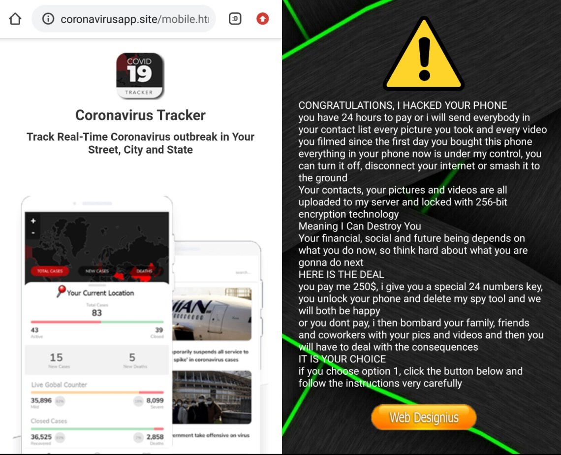 A su vez, se descubrió un ransomware (ransomware: software, programa o app que restringe el acceso a determinadas partes o archivos del sistema operativo infectado y pide un rescate a cambio de quitar esta restricción) oculto en una falsa aplicación para el monitoreo del coronavirus. Denominado CovidLock, esta aplicación, ofrece un mapa de calor con datos estadísticos sobre el avance del virus en el mundo. Sin embargo, tras analizar este el dominio sospechoso, se identificó que la app ocultaba un ransomware para Android que bloquea a la víctima el acceso al dispositivo, al cambiar la contraseña que utiliza el usuario y asi secuestrando el teléfono. Luego despliega a la víctima un mensaje en el cual amenaza con robar y enviar la información que contiene el dispositivo a cambio del pago de $250. Según el investigador de ESET, Lukas Stefanko, quien analizó la amenaza, quienes hayan sido víctima de este ransomware podrán desactivarlo usando el código de desbloqueo “”4865083501”.