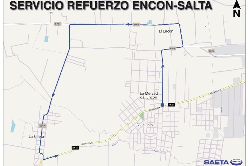 El nuevo circuito Encon-Salta partirá a las 6:35 con inicio por Estación Vieja (Merced Chica) – R.P. Nº93 – R.P. Nº94 – R.P. Nº 91 – R.P. Nº 92 – salida por La Silleta – R.N. Nº51 – recorrido habitual hacia la ciudad de Salta.