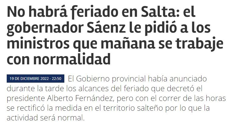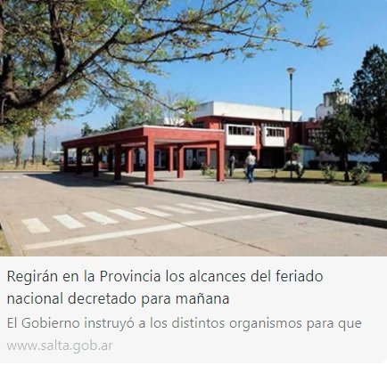 En horas de la tarde de hoy en sitio web del Gobierno de la Provincia anunciaba que "Regirán en la Provincia los alcances del feriado nacional decretado para mañana", tal como lo muestra el anuncio.