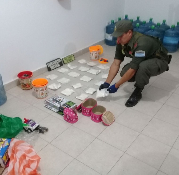 Por último, los gendarmes efectuaron el registro de un ómnibus proveniente de la provincia de Tucumán con destino final la ciudad de Salvador Mazza, constatando que una ciudadana trasladaba una bolsa con juguetes. En el interior de los mismos se acondicionaban 3 kilos 130 gramos de cocaína distribuidos en 9 paquetes.