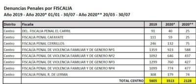 Desde el 1 de enero al 30 de julio, el Ministerio Público Fiscal recibió un total de 5181 denuncias por violencia de género (repartidas unas 3513 denuncias en el Distrito Judicial del Centro; 588 en el Distrito Judicial del Sur; 541 en el Distrito Judicial Orán y otras 539, en el Distrito Judicial de Tartagal).
