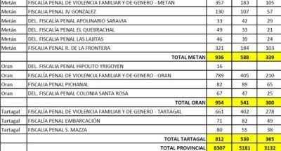 Del total, 2128 correspondieron al Distrito Judicial Centro; 339 al Distrito Judicial Sur; 365 al Distrito Judicial Tartagal y 300, al Distrito Judicial Orán.