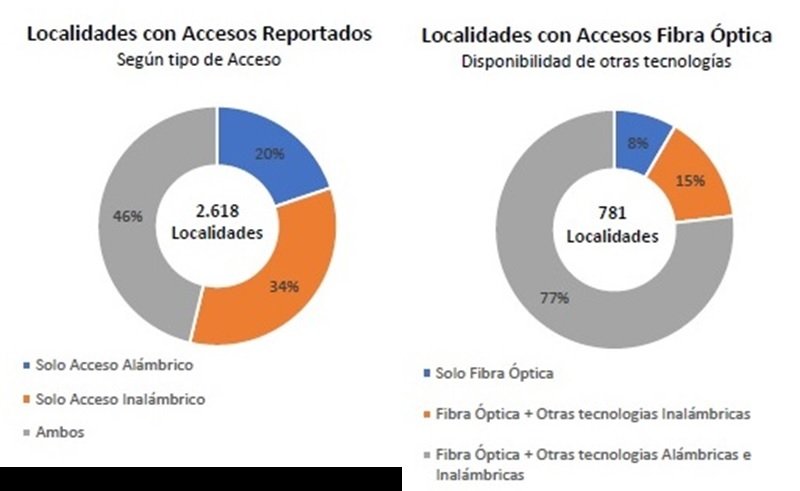 En la Argentina se reportan 2.618 localidades con acceso a internet, el 34% cuenta con acceso alámbrico, el 20% con acceso inalámbrico y el 46% cuenta con ambos tipos de tecnologías de acceso. De ese total de 2.618 localidades, apenas un 30% (781 localidades) cuenta hoy con opciones de accesos por fibra óptica, situación que muestra a las claras que hay aún mucho camino por recorrer en relación al desarrollo de las conectividad y la mejora de las redes.