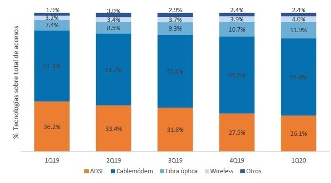 Con 2.299.457 de accesos ADSL al mes de marzo de 2020, esta tecnología continua en franco retroceso, contabilizando una caída del 27% en el total de conexiones entre marzo de 2019 y marzo de este año y perdiendo 10 puntos de participación en el mismo período.