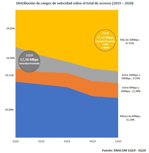 Como parte de este proceso, se observa también una sustancial disminución en las conexiones con velocidades inferiores a 20 Mbps, que caen de un 70,98% a un 52,03% del total de conexiones de un año al otro.