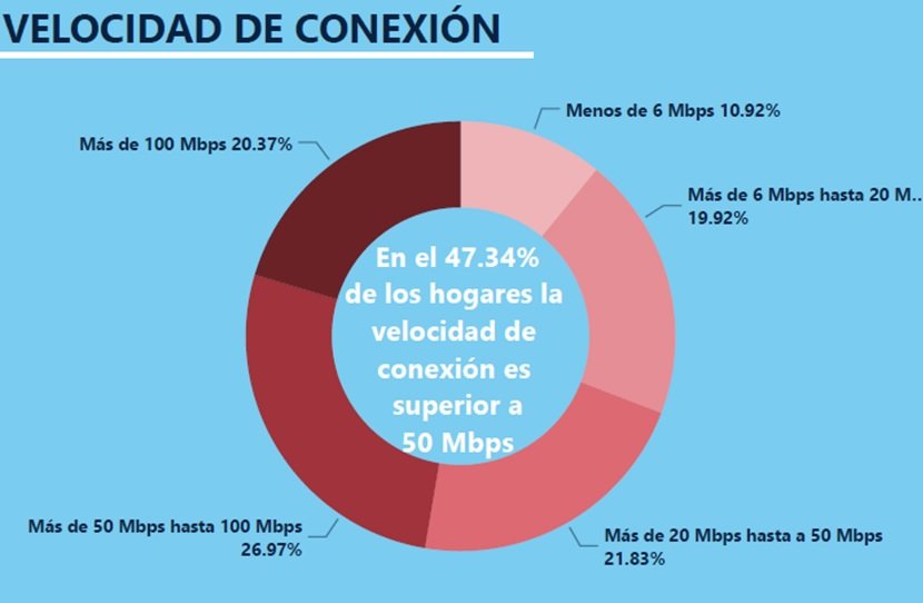 En el extremo inferior, casi el 11% de los hogares cuenta con una velocidad de conexión inferior a los 6 MB, La serie se completa con el 20% de los hogares con velocidades de entre 6 y 20 Mbps y el 22% con velocidades de entre entre 20 y 50 Mbps.