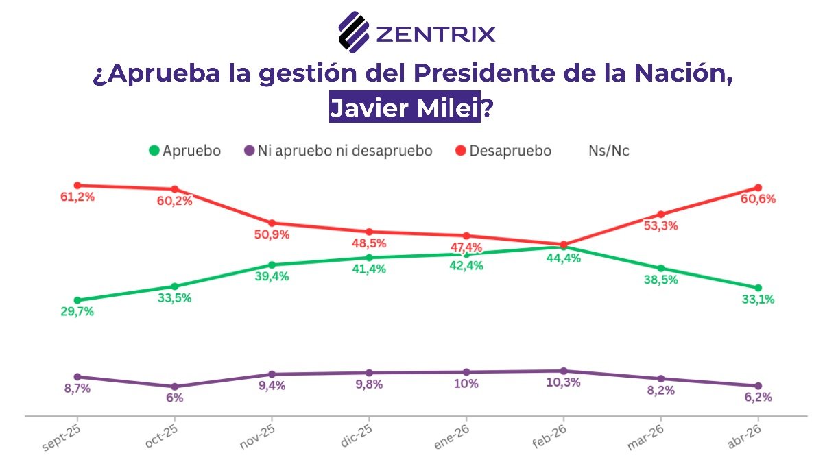 Los datos surgen del Monitor de Opinión Pública (MOP), un estudio desarrollado desde Zentrix Consultora con el propósito de relevar percepciones políticas y económicas de la población residente en la Argentina. El relevamiento, correspondiente a la medición de abril incluyó 1.559 casos válidos con cobertura nacional. Fue realizado mediante un diseño muestral ponderado por región y edad según el último padrón electoral. La recolección de datos se efectuó a través de un cuestionario autoadministrado en línea, con difusión controlada y posterior depuración de registros inválidos. Se aplicaron mecanismos de validación mediante variables externas (como el voto declarado en el balotaje presidencial de 2023 y las elecciones legislativas de octubre de 2025), y los resultados fueron ajustados para garantizar representatividad nacional. Bajo estas condiciones, el margen de error teórico se estima en ±2,48%, con un nivel de confianza del 95%. Los resultados no deben extrapolarse a niveles subnacionales sin la debida cautela metodológica.