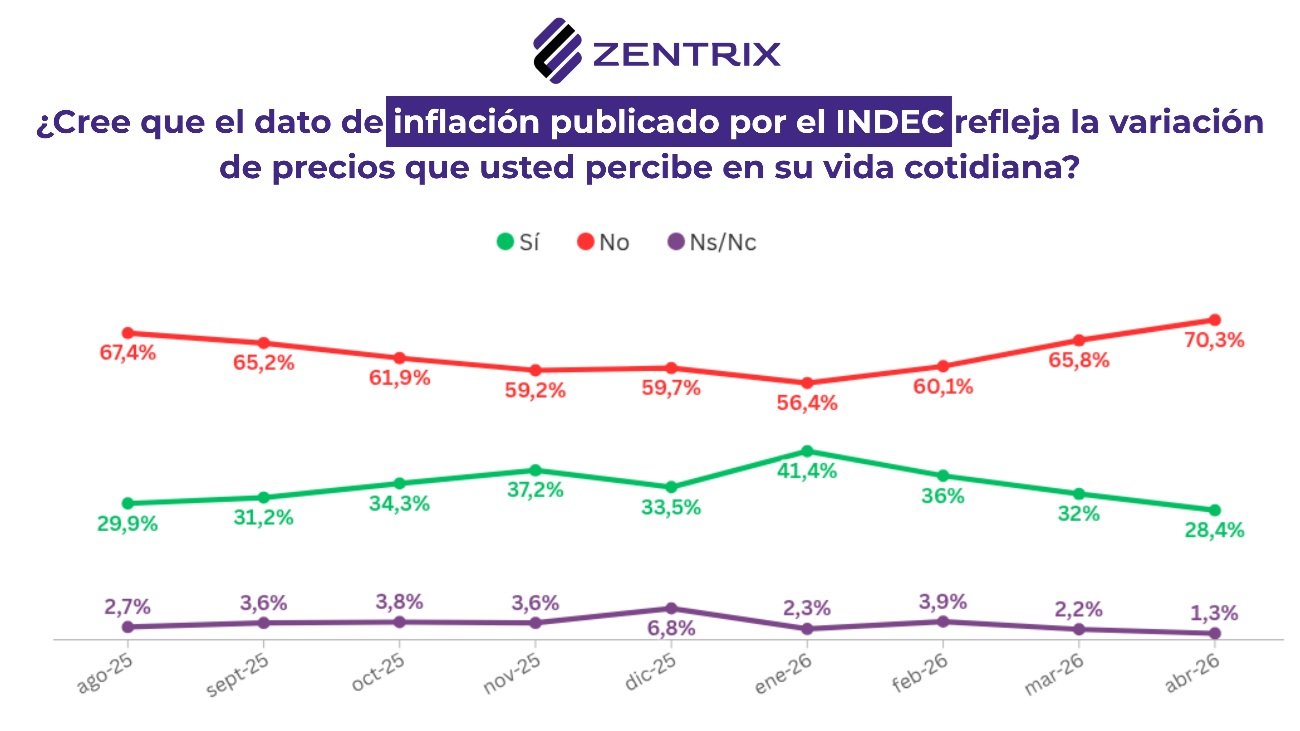 En abril, la distancia entre la economía que informa el INDEC y la economía que viven los hogares volvió a ampliarse. El 70,3% de los consultados considera que el dato oficial de inflación no refleja adecuadamente la variación de precios que percibe en su vida cotidiana, un salto importante respecto de enero, cuando esa mirada alcanzaba al 56,4%, el valor más bajo de la serie. No se trata sólo de una discusión sobre metodología o sobre cómo se construye un índice: lo que aparece es una crisis de validación social del dato público. Cuando la inflación oficial deja de coincidir con la sensación cotidiana de encarecimiento, el problema deja de ser estadístico y pasa a ser político, porque se debilita la confianza en una de las referencias centrales con las que el Gobierno busca reforzar el debate económico.