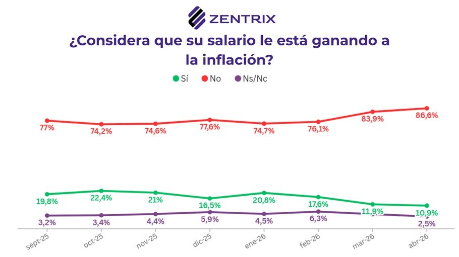 Esa desconfianza encuentra una explicación concreta en el bolsillo. El 86,6% afirma que su salario no le gana a la inflación, el peor registro de toda la serie reciente, por encima del 74,7% de enero y del 83,9% de marzo. Ahí está el núcleo del problema; la sociedad no compara el dato oficial con una abstracción, sino con el resultado material que deja en la vida diaria. La inflación ya no se mide en decimales, sino en cuánto dura el ingreso, cuánto margen queda después de pagar lo básico y hasta qué fecha del mes se puede sostener el consumo habitual. Por eso, cuando el índice baja, pero el salario sigue sin recomponer poder de compra, el dato pierde capacidad de persuadir. El número oficial puede ordenar la macro, pero si no corrige la experiencia real del hogar, deja de ser creíble para una mayoría social.