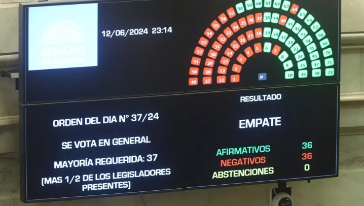 El Senado de la Nación aprobó en general la Ley Bases, tras una votación que culminó 36-36 y que debió desempatar la presidenta del cuerpo, Victoria Villarruel, a favor del proyecto del Ejecutivo.