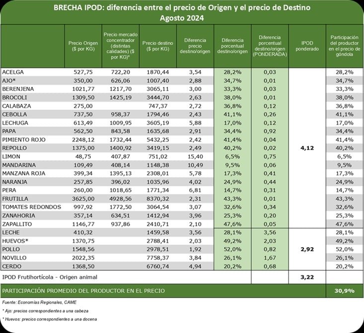 En agosto, los precios de los agroalimentos se multiplicaron por 3,2 veces del campo (origen) a la góndola (destino). Es decir, el consumidor pagó $3,2 por cada $1 que recibió el productor, según el Indicador de Precios en Origen y Destino (IPOD) elaborado por el sector de Economías Regionales de la Confederación Argentina de la Mediana Empresa (CAME).