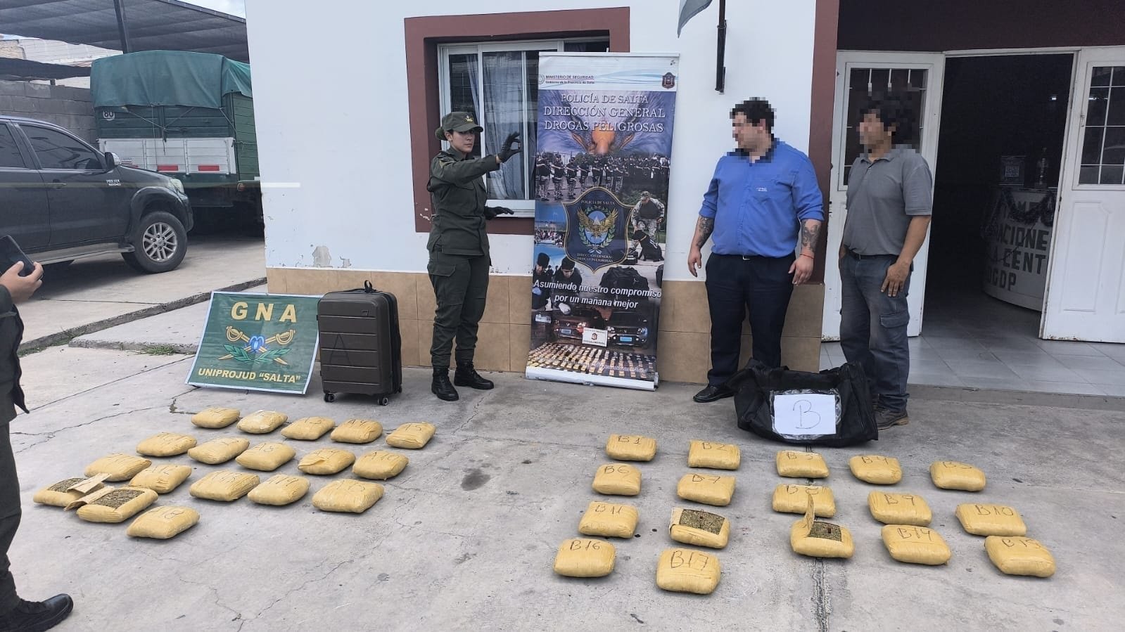Al momento de la inspección, gendarmes junto a personal de la Policía provincial percibieron en el sector de la bodega un fuerte olor característico de la marihuana, proveniente de dos valijas. Ahí, los funcionarios detectaron 35 paquetes dentro de dos valijas que sometidos a la prueba de campo narcotest dieron como resultado positivo para “cannabis sativa” con un peso total de 36 kilos 730 gramos.