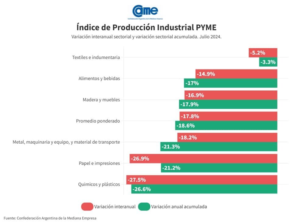 La actividad manufacturera de las pymes (pequeñas y medinas empresas) cayó 17,8% anual en julio y acumula una retracción de 18,6% en los siete meses del año frente al mismo período de 2023. En la comparación mensual desestacionalizada la producción bajó 1,8%. Las pymes trabajaron en julio con el 60,6% de su capacidad instalada (en junio había sido el 60,1%). El 19,3% de las pequeñas y medianas empresas tuvo dificultades para pagar salarios.