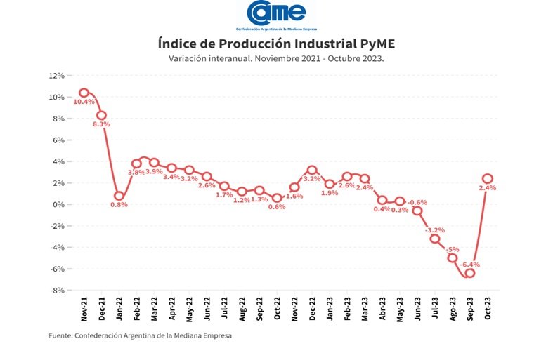 Estos resultados surgen del Índice de Producción Industrial Pyme (IPIP), que elabora la Confederación Argentina de la Mediana Empresa (CAME), con una muestra que alcanzó a 409 industrias pyme a nivel federal.