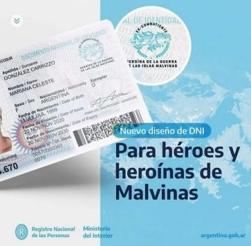 El Registro Civil informó que por disposición nacional ya se oficializó el nuevo diseño del Documento Nacional de Identidad (DNI) que está destinado exclusivamente a excombatientes de la guerra de Malvinas. Los mismos tendrán desde ahora en adelante, una insignia identificatoria en sus ejemplares; esto quedó oficializado a través de la Disposición 214 en consonancia con lo marcado en el artículo 17 inciso f) de la Ley Nº 17.671.
