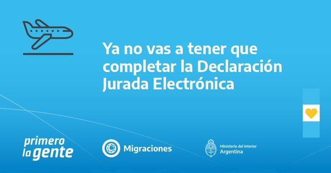 "Eliminamos la declaración jurada. Ya no será necesario realizar la DDJJ para ingresar o salir del país. Seguimos haciendo que viajar sea más rápido y más sencillo", publicó en su cuenta de Twitter la Directora Nacional de Migraciones, Florencia Carignano,