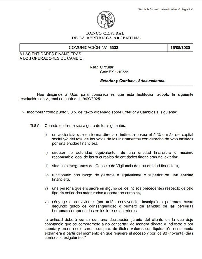 A través de la comunicación “A” 8332, la autoridad monetaria dispuso que las entidades financieras y operadores de cambio deberán contar con una declaración jurada en la que deje constancia que sus accionistas con participación mayor al 5%, directores, síndico o integrantes del Consejo de Vigilancia, y/o parientes cercanos a las personas mencionadas anteriormente, que compran "billete verde" en el MLC, se comprometen a no comprar dólares en la bolsa durante 90 días.
