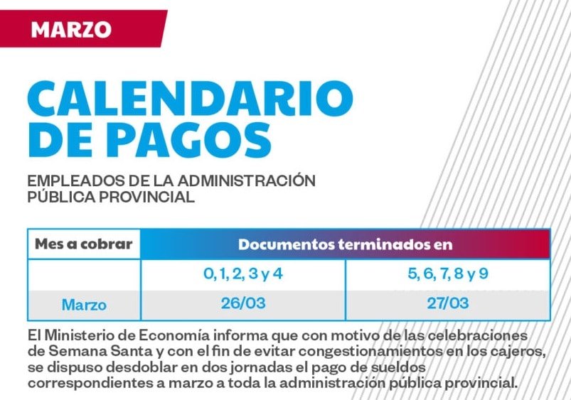 El Ministerio de Economía de Santiago del Estero informó que con motivo de las celebraciones de Semana Santa y con el fin de evitar congestionamientos en los cajeros, se dispuso desdoblar en dos jornadas el pago de sueldos correspondientes a marzo a toda la administración pública provincial.